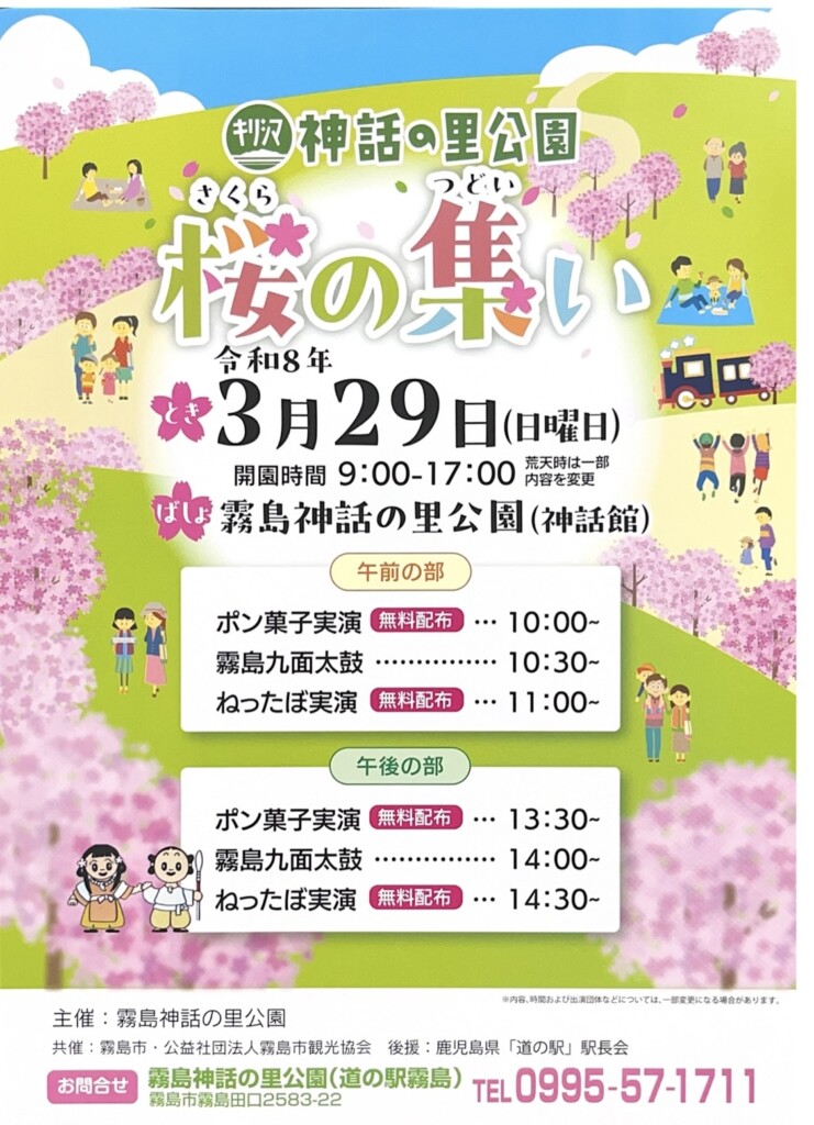 園内約500本の満開の桜とともに、霧島九面太鼓の演奏や、振るまいポン菓子、